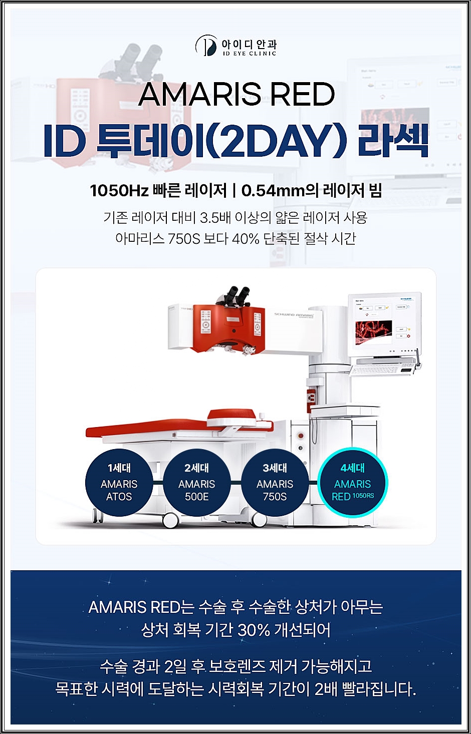 첫째, 오늘의 라섹은 현존하는 레이저빔 중 가장 빠르고 작은 빔을 사용하여 손상을 최소화하였습니다. 이를 통해 복구에 소요되는 기간이 대폭 단축되었으며, 빛이 산란되지 않고 중복 조사와 레이저 간 간격을 줄여 정밀한 보정이 가능했다. 기존 라섹에서는 2차원 평면 형태에 따라 조사가 이루어졌으나, 스마트 펄스 시스템이 적용된 아이디안과 투데이라섹 과정에서는 3차원 풀러렌을 기반으로 3차원 구형 형태에 초점을 맞춰 레이저 조사점을 계산하여 정밀한 조사를 진행합니다.