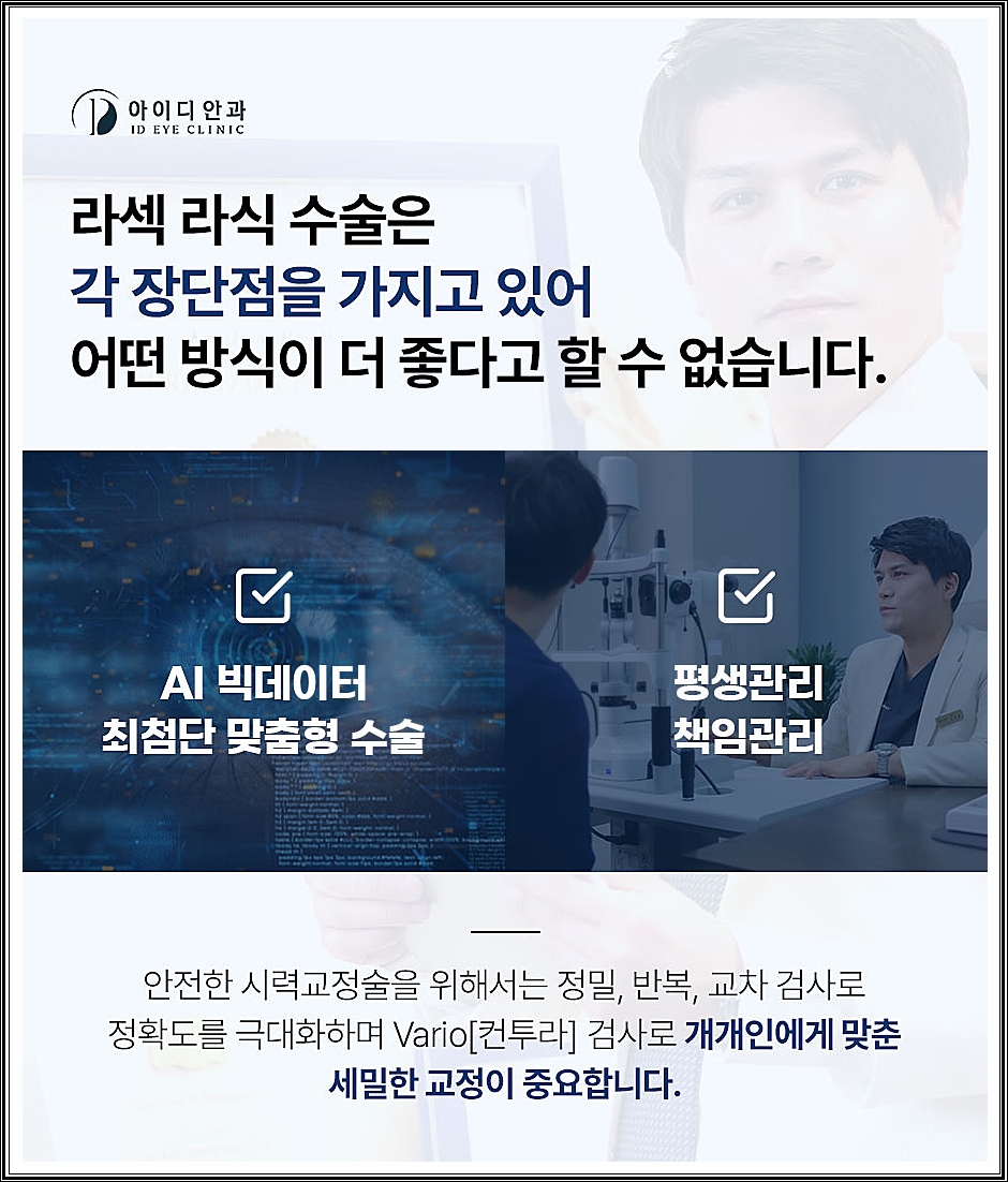 장비를 선택하는 과정은 의료진의 실력과 노하우에 따라 달라지기 때문에 세심한 고려가 필요했습니다. 또한, 시력교정수술 후에도 적절한 관리가 이루어지지 않을 경우 목표시력으로 회복하는 데 다소 시간이 소요될 수 있으며, 교정된 시력을 유지하는 데 어려움이 발생할 수 있으므로 체계적인 사후관리가 이루어지고 있는지 면밀히 점검할 필요가 있습니다.