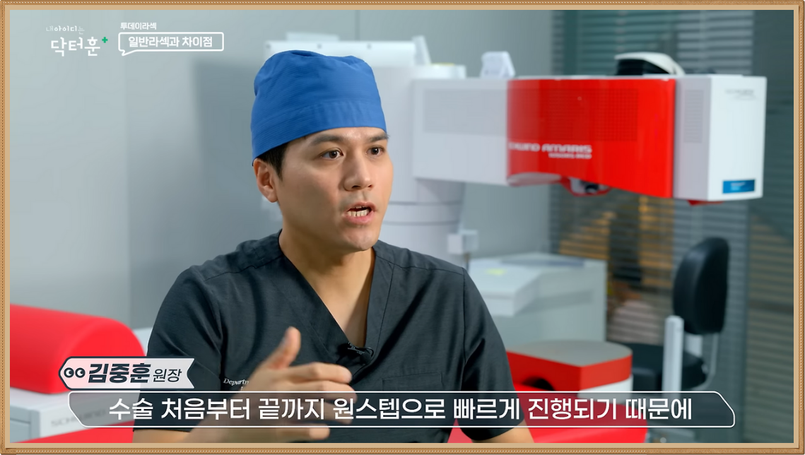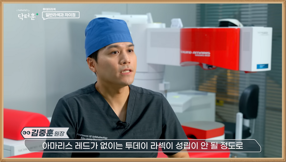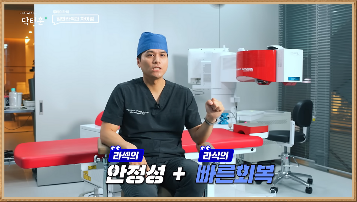 투데이라섹은 SPT 아마리스 레드 장비를 이용해 각막 상피와 실질을 레이저로 한번에 절삭함으로써 각막 손상을 줄여보는 과정으로 진행되는데요. 기존 장비보다 미세한 레이저 빔을 사용해 더욱 정밀한 진행이 가능하며 7차원 안구 추적 시스템으로 안구 움직임을 예측할 수도 있습니다.