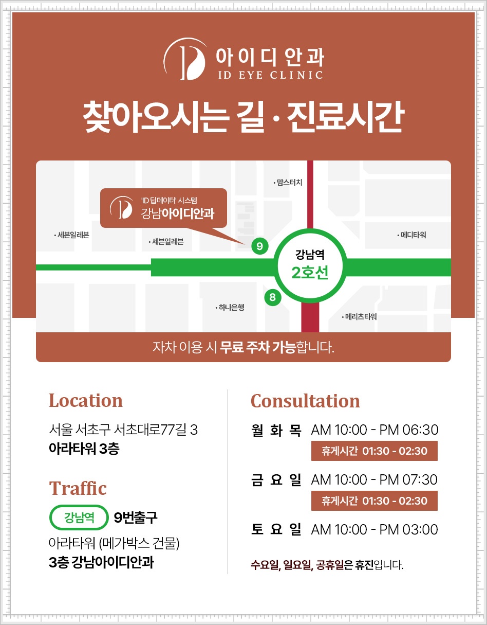 성공적인 시력 교정은 단순히 안경을 벗는 것에 그치지 않고, 야간 빛 번짐이나 안구 건조증 같은 불편함을 최소화하여 '삶의 질'을 높이는 데 목적이 있습니다. 동공 크기, 눈물막 안정도, 야간 시력 등 수많은 지표를 종합한 데이터 설계가 필요한 이유입니다. 또한 수술 직후 자외선 차단, 규칙적인 인공눈물 사용, 눈 비비지 않기 등 환자분의 적극적인 협조가 시력의 완성도를 결정짓습니다. 검사부터 수술, 그리고 꼼꼼한 사후 관리까지 전 과정을 책임지는 시스템을 갖춘 강남안과추천 기준을 세우신다면, 소중한 여러분의 눈을 믿고 맡기실 수 있을 것입니다.